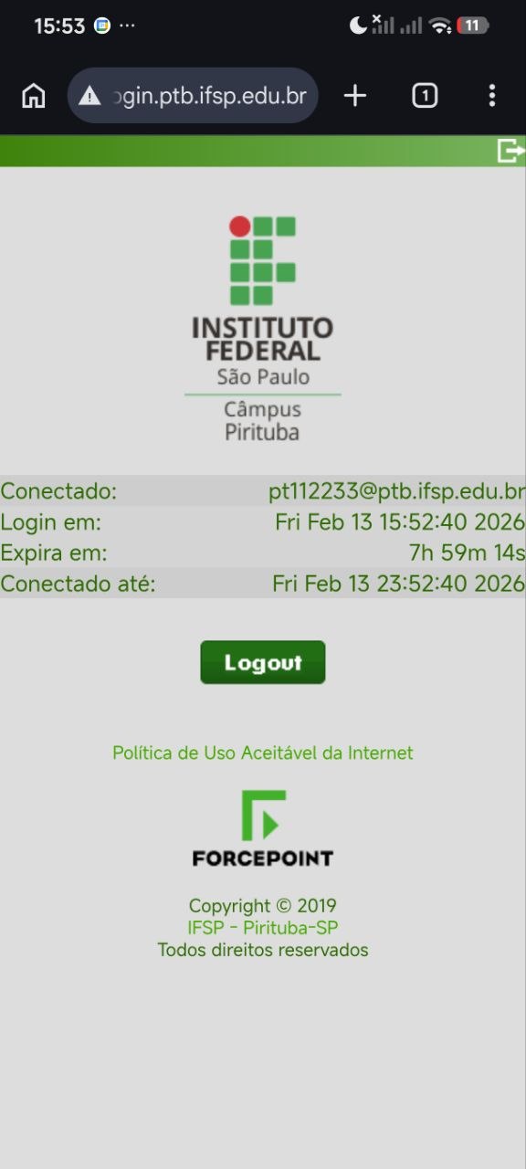 Após aparecer a tela de conectado, a aba ou janela pode ser fechada (Não clique em Logout)