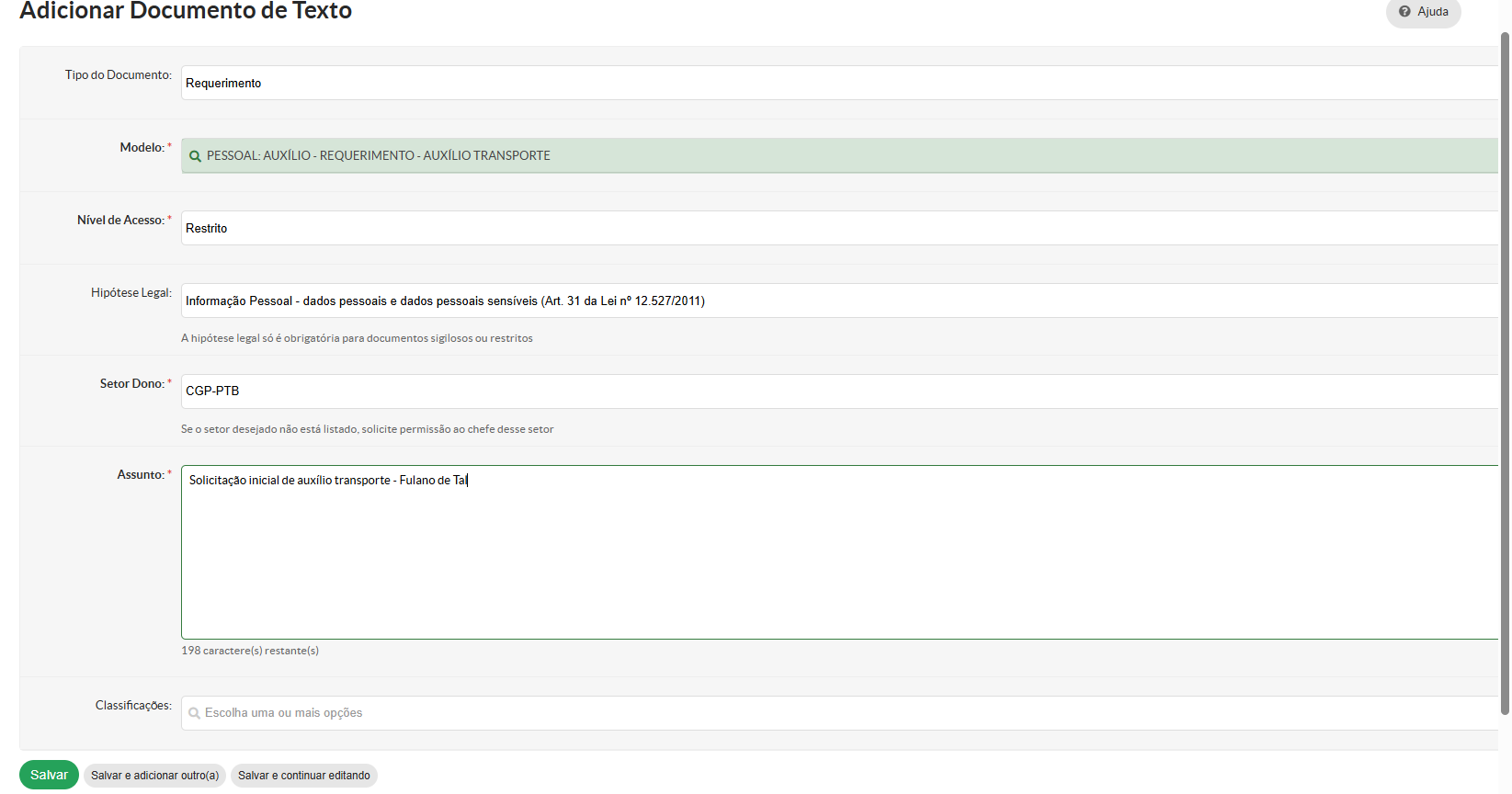 4.6 Informe resumidamente o tipo de solicitação seguido de seu nome (Exemplo: “Solicitação inicial de auxílio transporte - Fulano de Tal”)