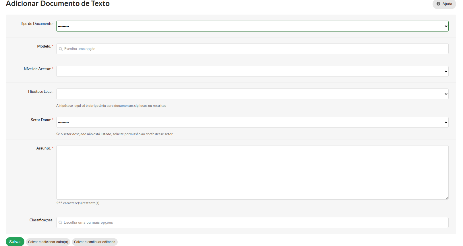 4. Você deve preencher os campos disponíveis com os parâmetros necessários para o tipo de documento escolhido, por exemplo: